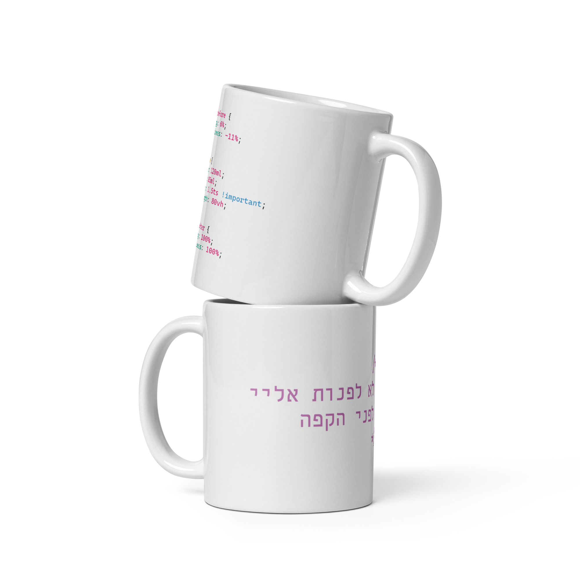 A bold and stylish CSS mug printed with the Hebrew warning: