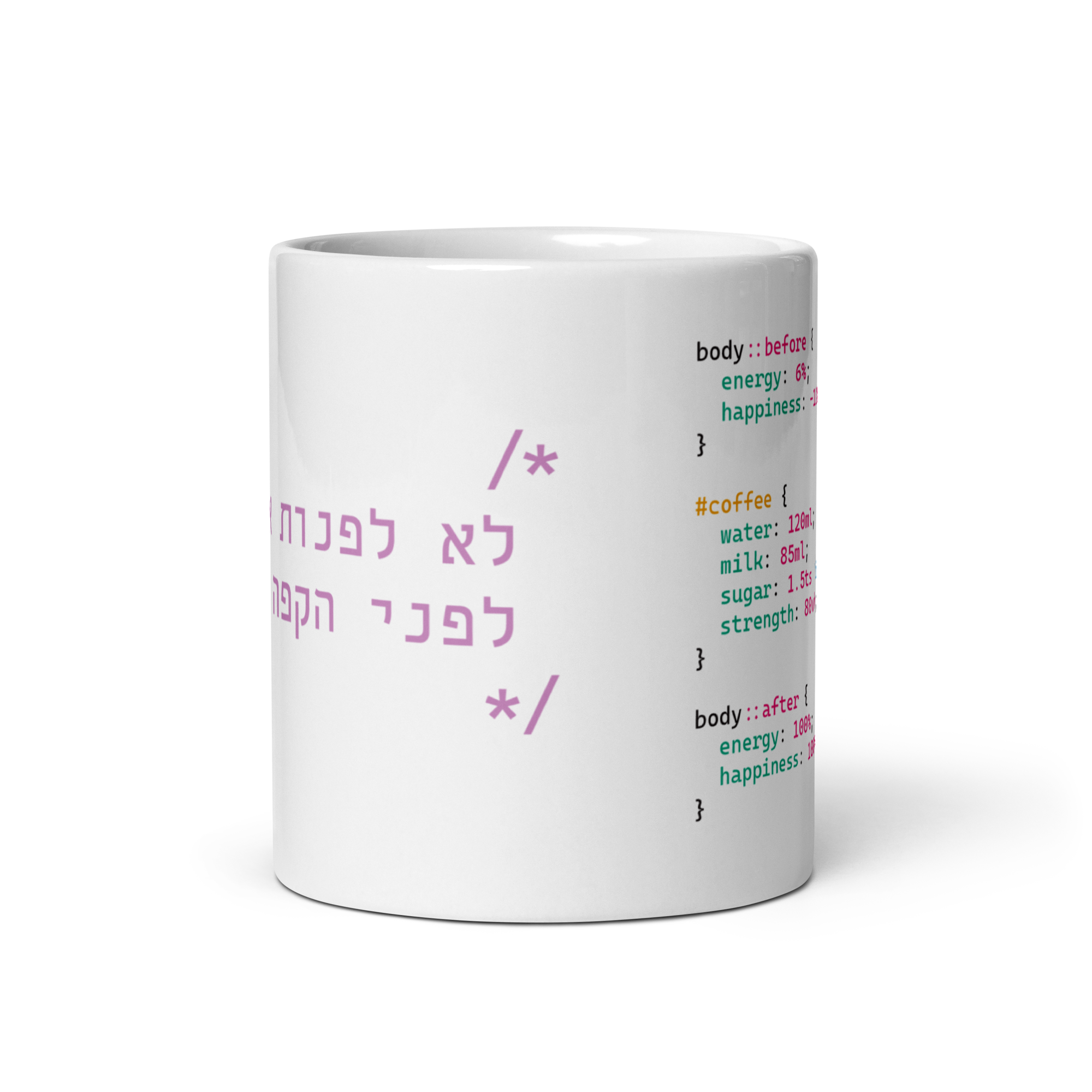 /* לא לפנות אליי לפני הקפה */If you live by clean code, pixel-perfect design, and the unbreakable rule of espresso first, socializing later — this developer coffee mug was made for you. An elegant and humorous addition to any home or office setup. Details: • Capacity: 325 ml (11 oz) • Dimensions: Height 9.8 cm (3.85 in), Diameter 8.5 cm (3.35 in) • Lead-free, high-quality ceramic • Glossy finish • Dishwasher and microwave safe